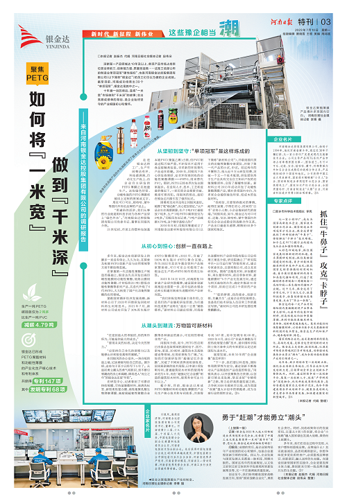 7月10日,《河南日?qǐng)?bào)》聯(lián)合《大河財(cái)立方》刊發(fā)銀金達(dá)董事長(zhǎng)閆銀鳳專題訪談《這些豫企相當(dāng)潮丨河南銀金達(dá)控股集團(tuán)有限公司:如何將“一米寬”做到“千米深”》,聚焦銀金達(dá)創(chuàng)新驅(qū)動(dòng)潮流涌動(dòng)的發(fā)展態(tài)勢(shì),新鄉(xiāng)市科學(xué)技術(shù)局李亮局長(zhǎng)對(duì)銀金達(dá)的創(chuàng)新驅(qū)動(dòng)高質(zhì)量發(fā)展之路給予高度評(píng)價(jià)。全文如下: